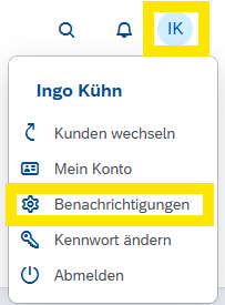 - Klicken Sie rechts oben auf Ihre Initialen und anschl. auf Benachrichtigungen