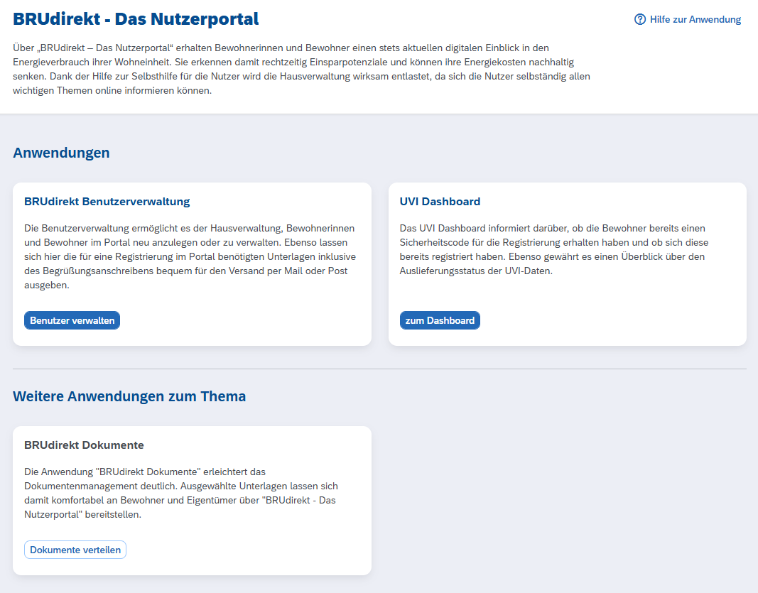 Die Anwendungen BRUdirekt Benutzerverwaltung, Dokumente freischalten und UVI-Dokumente wurden in einer neuen Gruppenkachel namens BRUdirekt zusammengefasst.
