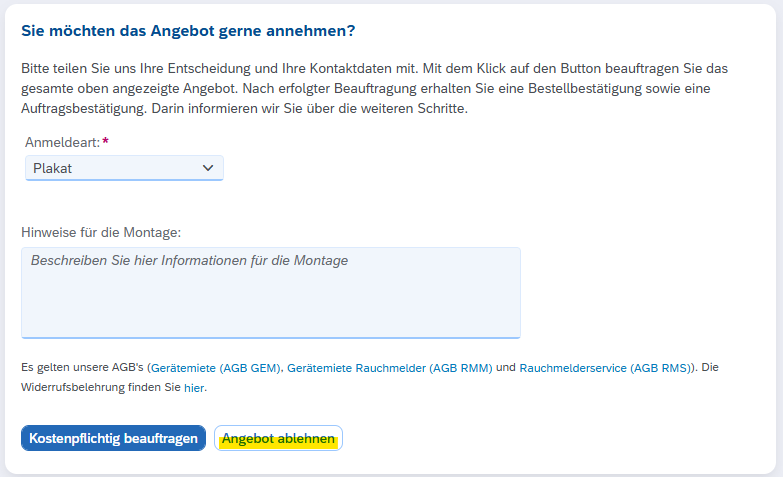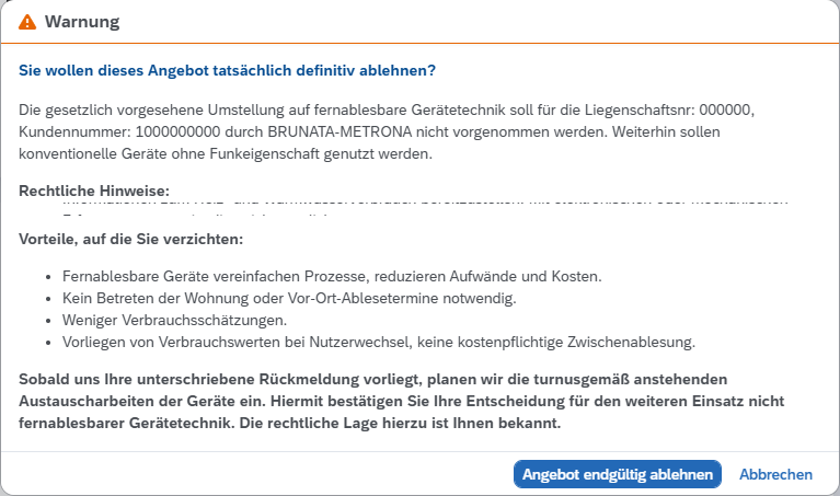 Ablehnung von Angeboten: Hochrüstangebote nun auch direkt im Kundenportal abgelehnt werden. Nach dem Klick auf „Angebot ablehnen“ erscheint ein Hinweis zu den rechtlichen Rahmenbedingungen. Anschließend erhalten sie eine Bestätigungs-E-Mail mit dem abgelehnten Angebot als Anhang.