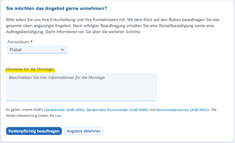 Bauliche Hinweise bei Annahme: Sie haben nun die Möglichkeit, bei der Angebotsannahme bauliche Hinweise zur Montage zu hinterlegen.