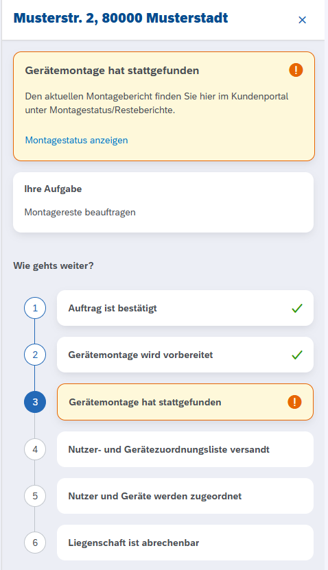 Status Gerätemontage: In den beiden Status Gerätemontage wird vorbereitet und Gerätemontage hat stattgefunden kann nun auf die Anwendung Montagestatus abgesprungen werden. Hierbei wird direkt in den Montageauftrag gesprungen.