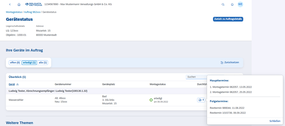 Im Montagestatus können Sie jederzeit nachvollziehen, welche Termine zu einem Auftrag stattgefunden haben und ob kostenpflichtige Anfahrten entstanden sind. Alle relevanten Informationen finden Sie direkt in der Detailansicht des jeweiligen Auftrags.