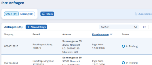 In der Anwendung Kontakt – Anfragen können Sie uns Ihre Anliegen direkt über das Kundenportal senden. Ihre gesendeten Anfragen sehen Sie anschließend übersichtlich in einer Liste.