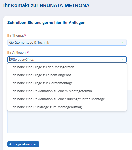 - Im zweiten Dropdown „Ihr Anliegen“ wählen Sie Ihr konkretes Anliegen, zum Beispiel „Ich habe eine Rückfrage zu einem Montageauftrag“.